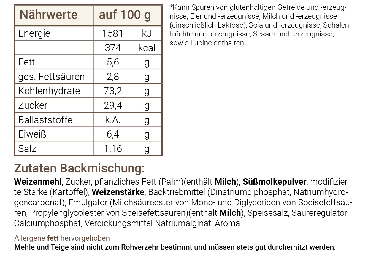 Weizenmehl, Zucker, pflanzliches Fett (Palm)(enthält Milch), Süßmolkepulver, modifizierte Stärke (Kartoffel), Weizenstärke, Backtriebmittel (Dinatriumdiphosphat, Natriumhydrogencarbonat), Emulgator (Milchsäureester von Mono- und Diglyceriden von Speisefettsäuren, Propylenglycolester von Speisefettsäuren)(enthält Milch), Speisesalz, Säureregulator Calciumphosphat, Verdickungsmittel Natriumalginat, Aroma